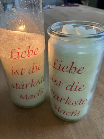 Dafür muss sie sich erst etwas einbrennen, soll also immer eine Stunde oder länger angezündet sein, mindestens so lange, bis der Wachsspiegel bis zum Rand des Glases geht. Beim ersten Drittel bleibt aber erfahrungsgemäß seitlich