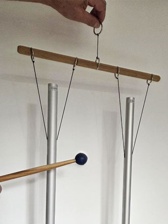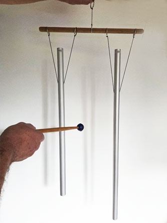 Das Set enthält zwei Klangrohre mit Ringen, die durch ein Seil durch das Rohr befestigt sind, eine Aufhängung aus Holz und einen Gummiklöppel zum Anschlagen.