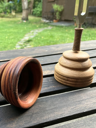 Diese einzigartige von uns entwickelte Konstruktion überträgt durch die besondere Form & Eigenschaften des Klangholzes die Schwingungen der Stimmgabeln effektiv & großflächig auf den Körper, wodurch die Vibration besonders kraftvoll wirken kann.